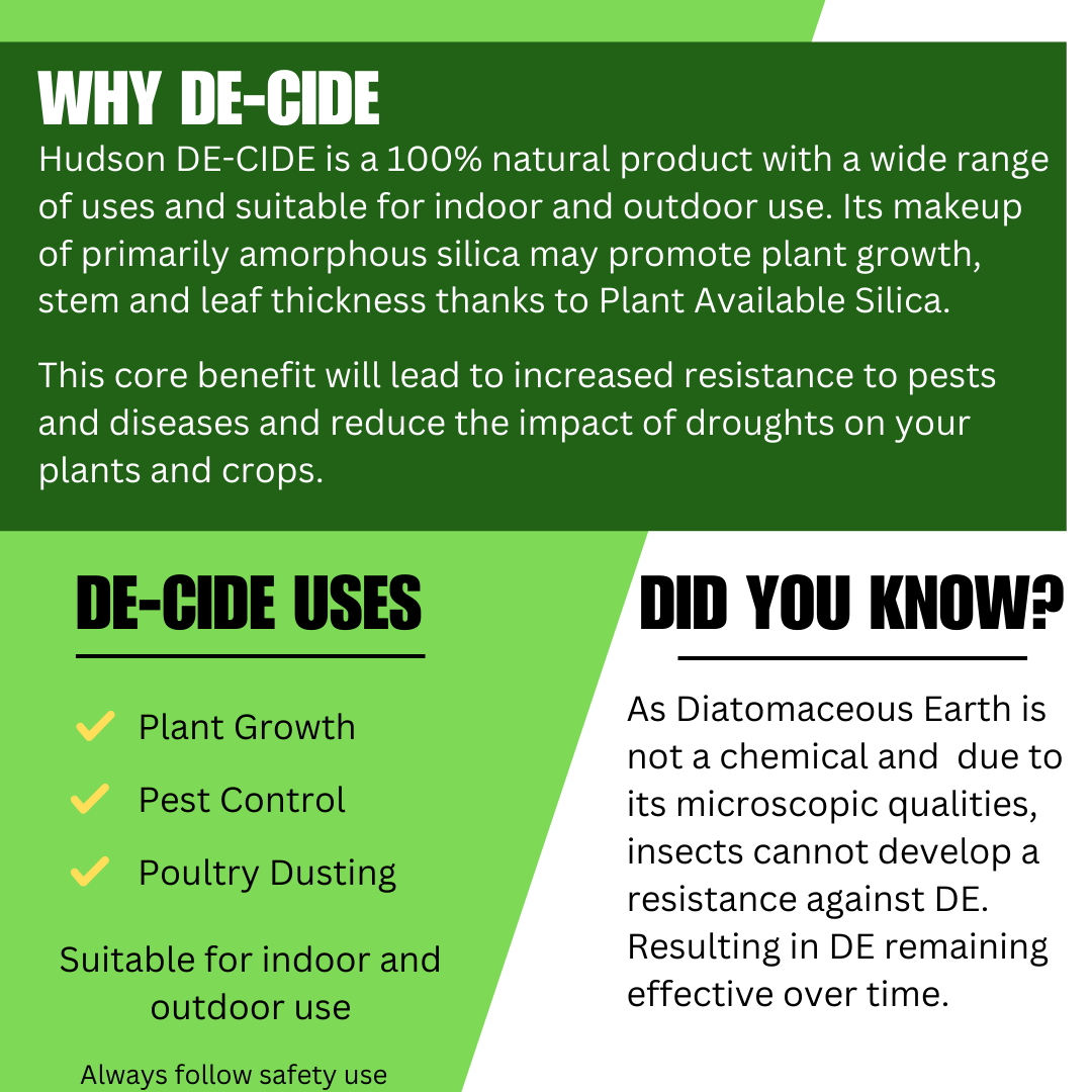 Western Australian Freshwater HUDSON DE-CIDE, made from shells of fossilized tiny aquatic organisms called diatoms. Plant growth by silica into plant available form.